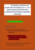 The KNH 188 bundled exam set (2025/2026) covers key topics in kinesiology, nutrition, and health, including human physiology, dietary principles, fitness assessment, and wellness promotion. It features multiple-choice and scenario-based questions with verified answers and detailed rationales, designed to test conceptual understanding, application skills, and critical thinking for comprehensive exam preparation.