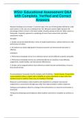 This document provides a full collection of questions and verified correct answers for WGU’s Educational Assessment course. It covers assessment foundations, types of assessments, grading practices, accommodations, validity and reliability, performance assessments, standards-based reform, federal education laws, Bloom’s Taxonomy, and instructional alignment.