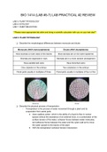 This review will give you most of the info you need to know for this upcoming practical in BIO 1414. I have included pictures (including formulas and slides), pre-lab & post-lab quiz questions, post-lab assignment questions, and objectives from each lab. I added a 4-page practice question with answers and brief explanations at the very end.
