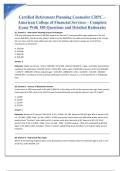 This document contains 180 CRPC exam-style questions with correct, verified answers and detailed rationales covering the full Certified Retirement Planning Counselor curriculum. The questions focus on retirement planning concepts, client analysis, investment strategies, tax considerations, and regulatory issues, aligned with the actual CRPC exam format. The material has been graded A+ and is suitable for final revision and exam preparation.