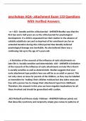psychology AQA- attachment Exam 133 Questions With Verified Answers - or + A03 : bowbly and the critical period - ANSWER-Bowlby says that the first two and a half years are as the critical period for psychological development. If a child is separated from their mother in the absence of suitable substitute care and so deprived of her emotional care for on extended duration during this critical period then Bowlby believed psychological damage was inevitable. He also believed there was a conti...