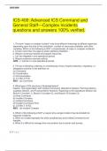 This document contains a complete and verified set of exam questions and answers for the 2025/2026 ICS-400 Advanced Incident Command System course. It covers critical concepts related to managing complex incidents, Area Command, Unified Command, Multi-Agency Coordination Systems (MACS), logistical challenges, public information management, and large-scale incident operations. Ideal for emergency management professionals preparing for ICS-400 certification or advanced training in incident managem...