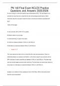 This document contains a comprehensive set of NCLEX-style practice questions and answers for the PN 140 Final Exam for the academic year 2025/2026. The material focuses on essential nursing topics such as acute and chronic kidney disease, peritoneal dialysis, HIV/AIDS management, hepatitis prevention, fluid and electrolyte imbalances, and nursing care for patients with renal complications. Includes detailed rationales for each answer to support understanding and exam success. Ideal for practical...