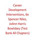 This is the complete, expert-verified test bank for the 6th edition of Career Development Interventions by Spencer Niles and JoAnn Harris-Bowlsbey. It features a comprehensive collection of learning outcome quizzes, application exercises, and test items with detailed feedback and correct answers for all chapters. The guide covers the evolution of work, the psychological link between self-worth and career success, and the sociological variables—such as opportunity structures and socioeconomic s...