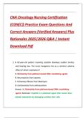 This is the complete practice exam and study guide for the CNA Oncology Nursing Certification (CON[C]). It features a comprehensive collection of exam questions and verified correct answers, complete with technical rationales for the 2025–2026 cycle. The guide covers critical oncological nursing topics, including chemotherapy side effects (such as cisplatin-induced ototoxicity), neutropenic precautions and ANC management, radiation skin care, and the management of oncologic emergencies like su...