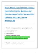 This is the complete, expert-verified practice examination and study guide for the Illinois Patient Care Technician (PCT) Licensing exam. It features a comprehensive collection of exam questions and verified correct answers, complete with clinical rationales for the 2026 cycle. The guide covers essential PCT responsibilities, including infection control through hand hygiene, vital sign monitoring (respiratory rates), patient positioning for respiratory distress (Fowler’s), and National Patient...