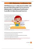 This document features a complete set of NPS Phlebotomy Test exam questions along with verified and 100% correct answers, updated for the 2025/2026 certification period. Designed to mirror the structure and content of the official National Phlebotomy Exam, this resource provides reliable preparation covering key areas such as venipuncture procedures, safety standards, and specimen handling.