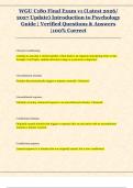 This document provides the complete set of verified questions and answers for the WGU C180 Introduction to Psychology Final Exam V1, fully aligned with the latest 2026/2027 course update. It covers major psychological concepts, theories, research methods, developmental stages, cognition, behavior, and exam-relevant applications. The material is designed to support accurate and efficient exam preparation with 100% correct solutions.