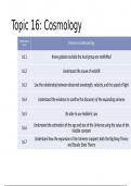 Summary and review notes of Edexcel GCSE Astronomy Paper 2, Topic 16- Cosmology. Here, there are comprehensive notes per specification point, topic-by-topic questions, and exam-style questions specifically related to the Topic. The "Cosmology" topic builds student's understanding of redshfit, Hubble's law, dark matter and energy, and evidence for the expanding universe
